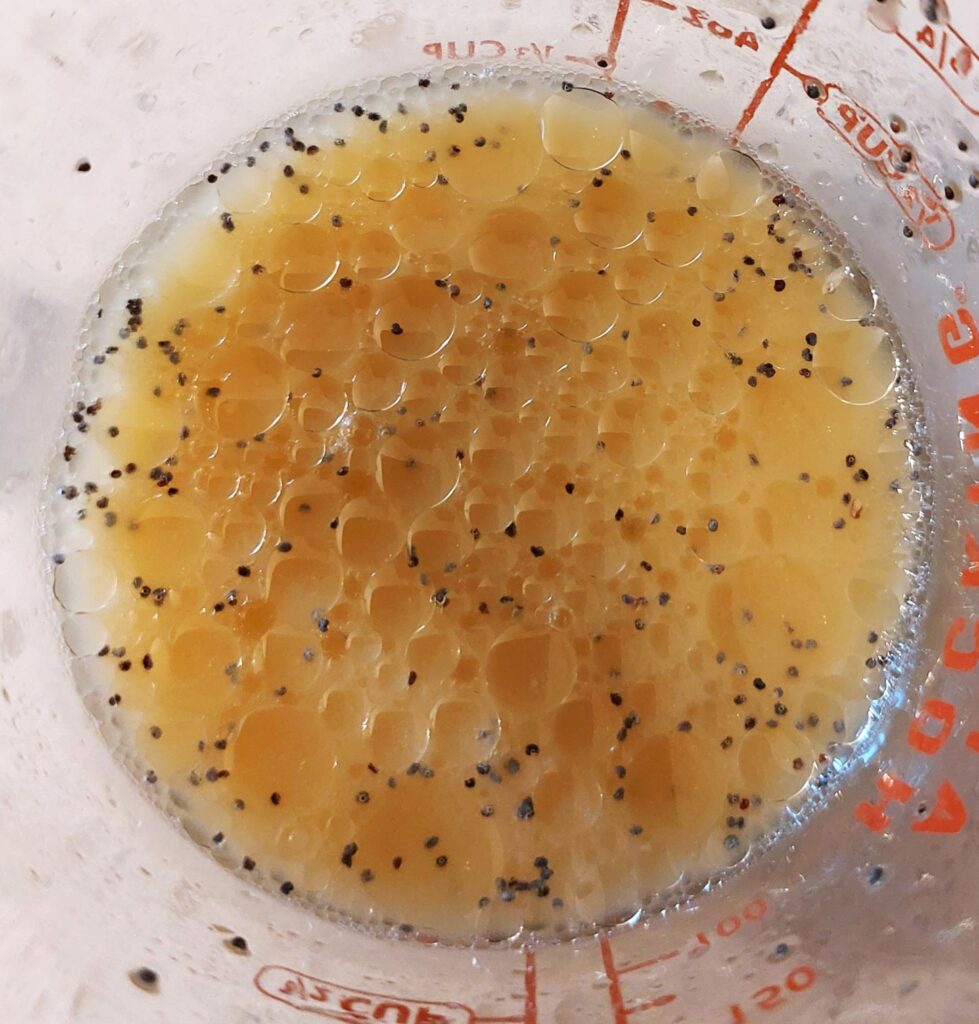 In a measuring cup, whisk together the plant based milk, o.j., oil, maple syrup, lemon juice, and poppy seeds.